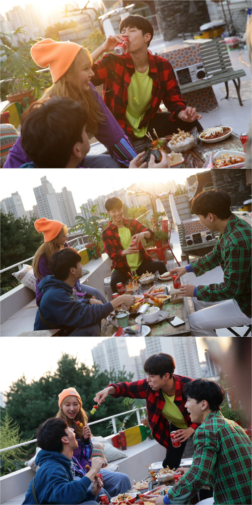 別のカットでは、パク・ボゴムが友人たちと屋上で軽食を楽しむ昼下がりの風景が公開された。子供のように無邪気な表情でコカ・コーラの缶を開け、気の置けない仲間たちとふざけ合っている。パク・ボゴムは多彩な表情と自然な仕草で和気あいあいとした雰囲気を一層強調し、新鮮な姿で見る者を惹きつけた。