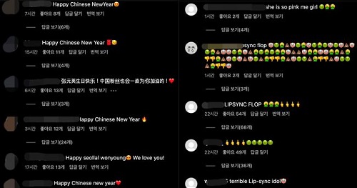 彼らは韓国の旧正月を“中国の文化”と主張している。実際に悪質なコメントと共に中国ユーザーは「Chiese new year」という挨拶で、コメント欄を埋め尽くしている様子だ。