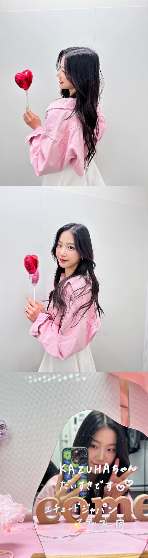 別の写真では、鏡越しに自撮りをしているカズハの姿が。鏡にはブランドスタッフから「だいすきです」というメッセージが書かれている。