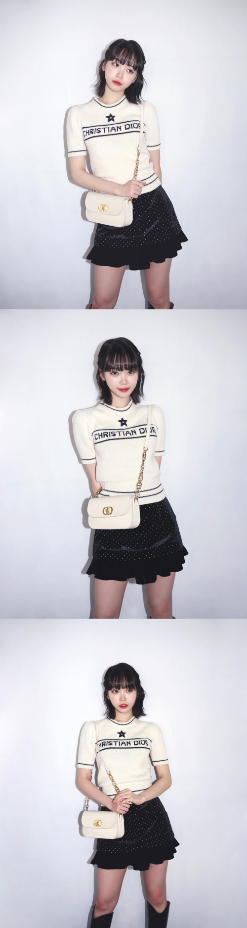 キム・チェウォンは半袖のニットトップスにドット柄のミニスカートを合わせたガーリーな装いで、髪はハーフアップにしている。