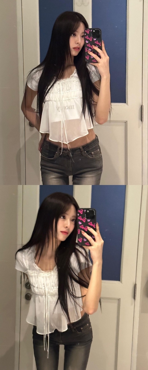 ユナは、レースのクロップドトップスにスキニーパンツという装い。スリムなウエストやメリハリある身体のラインなど、スタイルの良さをアピールしたコーディネートとなっている。