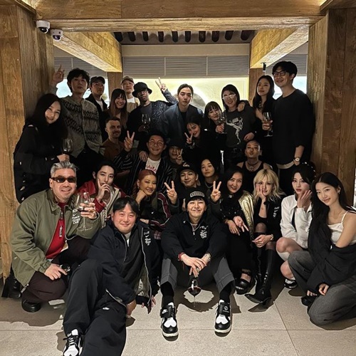 写真にはG-DRAGONだけではなく、BTS(防弾少年団)のRMとJIMIN、コード・クンスト、イ・スヒョク、テヤン、LE SSERAFIMのカズハとホ・ユンジン、ソン・ナウン、チョ・セホなどがカメラに向かってポーズを取っている。豪華絢爛な芸能人の集合写真だ。