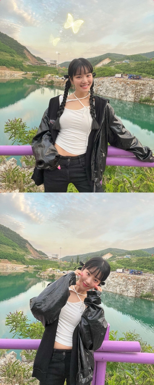 写真には、橋の上で記念撮影をするイ・ユビの姿が。キュートな笑顔を見せながら、三つ編みヘアでかわいさをプラスしている。