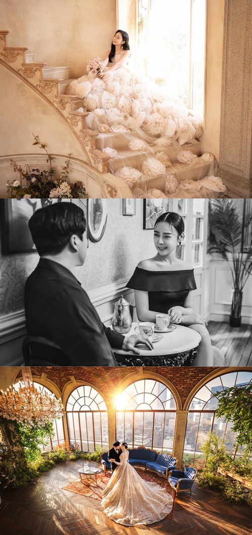 写真のチェ・ハンビッは、豊かな花飾りが目を引くオフショルダードレス、優雅さが引き立つシースルードレスなどを着用し、夫となる男性とポーズを取っている。