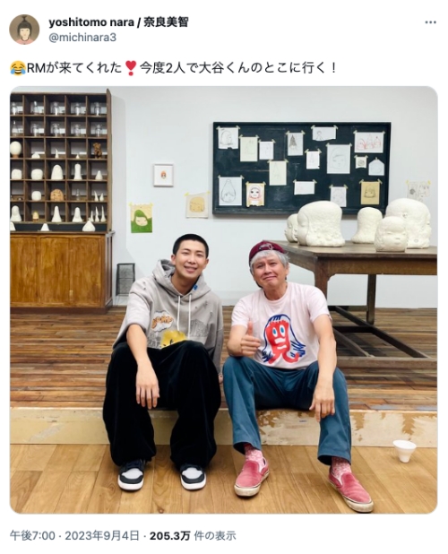 同日、奈良美智も自身のSNSにRMとのツーショットを投稿し、「RMが来てくれた!」と綴っている。