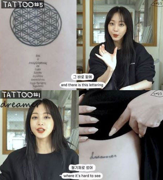 当該の動画を通じてハン・イェスルは、計12個のタトゥーを公開。“dreamer”、“never”、“Live Fast Live High”といった英字の一つひとつに込められた当時のストーリーを打ち明けた。さらに、最近新たに入れたタトゥーについては「“3本の剣”はそれぞれパワー・勇気・守護を意味している。“ヘビのように狡猾な人と接する知恵を持った人間でありたい”と思ってヘビのタトゥーも入れた」と解説している。