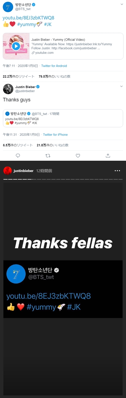 BTSのジョングク(JUNG KOOK)は1月9日、BTSの公式ツイッターを通じてジャスティン・ビーバーの新曲『Yummy』の映像を投稿。「#yummy #JK」というハッシュタグを付けた。当該の投稿は瞬く間に拡散され、世界30カ国以上のツイッター上でトレンドランキングを席巻した。