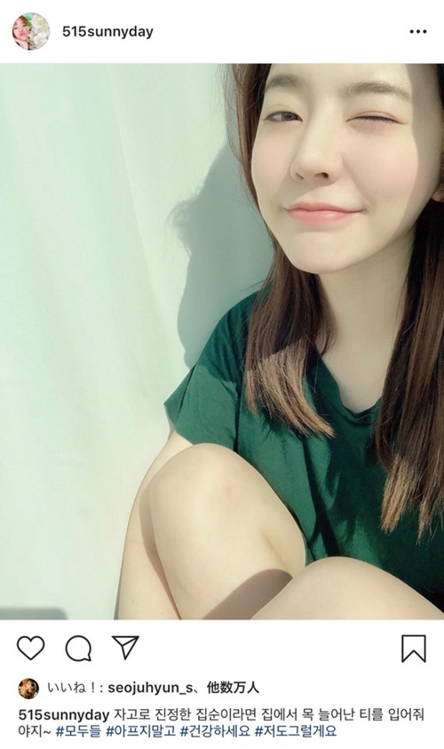 サニーは1月30日、インスタグラムに「真のチプスニ(インドア派)なら、家で首が伸びたTシャツを着てあげなきゃね~ 」と投稿。部屋着と思しきTシャツに身を包んだ自身の写真を掲載した。